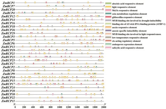 Prediction of cis-elements in promoters of 30 ZmRCP family members. Various colored boxes indicate different cis-elements that correspond to each colored box shown on the right side of the picture, and promoter lengths (base pairs) are shown on the scale below.