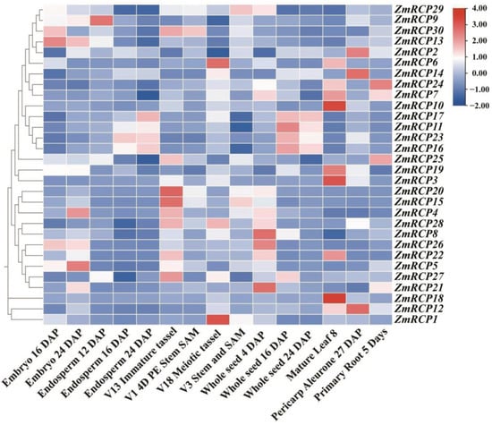 Expression pattern of 30 ZmRCP family members in different developmental stages and tissues. The different colors indicate the expression levels of the ZmRCP genes in maize. The expression data were downloaded from qTeller in MaizeGDB (https://qteller.maizegdb.org/genes_by_name_B73v5.php (accessed on 27 June 2024)) and the heatmap was generated using Tbtools software.