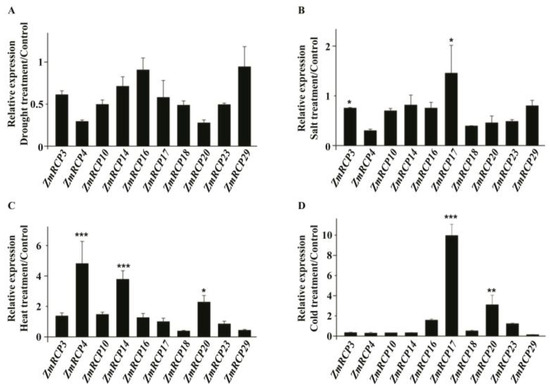 Expression levels of 10 ZmRCP members under abiotic stress treatments. Expression levels of 10 ZmRCP members were detected by RT-qPCR under drought (A), salt (B), heat (C), and cold (D) treatments. ZmActin (GRMZM2G126010) was used as the reference gene. Data are means (±SE) of three biological replicates. The comparison groups of Student’s t-test are treatment and control. Asterisks indicate significant differences between means calculated with Student’s t-test. * p < 0.05; ** p < 0.01; *** p < 0.001.