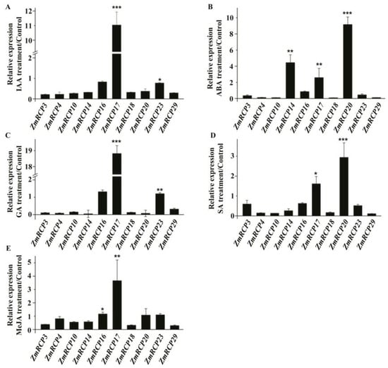 Expression levels of 10 ZmRCP members under different hormone treatments. Expression levels of 10 ZmRCP members were detected by RT-qPCR under IAA (A), ABA (B), GA (C), SA (D), and MeJA (E) treatments. ZmActin (GRMZM2G126010) was used as the reference gene. Data are means (±SE) of three biological replicates. The comparison groups of Student’s t-test are treatment and control. Asterisks indicate significant differences between means calculated with Student’s t-test. * p < 0.05; ** p < 0.01; *** p < 0.001.