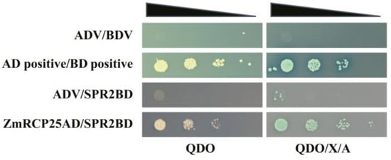 A previous study reported that ZmRCP25 (ZmDEK47) is required for the splicing of four introns of mitochondrial nad2 transcript and seed development. The small PPR protein 2 (SPR2) is required for the splicing of 15 mitochondrial group II introns in maize, including the 4 introns of nad2 [27], indicating that the functions of these two splicing factors are overlapped with each other. To test whether these two proteins interact with each other, we performed a yeast two-hybrid assay. The results showed that ZmRCP25AD/SPR2BD can grow on QDO or QDO/X/A medium (Figure 9), indicating that ZmRCP25 interacts with SPR2 in the yeast system.