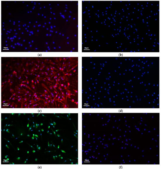 Immunofluorescence staining of the adhered macrophages after differentiation. Magnification 20X. (a,b) M0 macrophages negative for CD80 and CD163, respectively; (c) M1 macrophages positive for CD80 (red); (d) M1 macrophages negative for CD163; (e) M2 macrophages positive for CD163 (green); (f) M2 macrophages negative for CD80. Nuclei were stained with DAPI (blue).