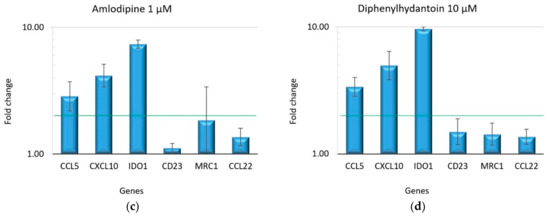 The gene expression profile of macrophages treated with different drugs after 48 h. Panel (a) shows the results of gabapentin treatment, panel (b) of mycophenolate, panel (c) of amlodipine, and panel (d) of diphenylhydantoin. All the treatments induced M1 polarization, as evidenced by the significant upregulation of CCL5, CXCL10, and IDO1 genes. The bars in the graph represent the fold change in gene expression on a logarithmic scale. The error bars indicate the standard deviation of fold changes calculated from two biological samples and three experimental replications. The green line marks a fold change = 2; the red line marks a fold change = 0.5.