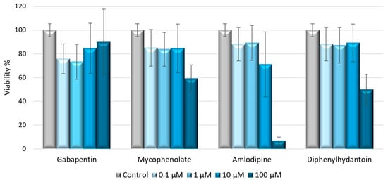 A preliminary test was performed to find the maximum concentration of the DIGO-inducing drugs that did not affect the viability of cultured macrophages. The following treatment concentrations were chosen: 100 µM for gabapentin, 10 µM for mycophenolate and diphenylhydantoin, and 1 µM for amlodipine.