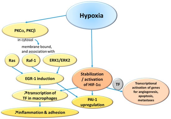 The main hypoxia-induced pathways of thrombus formation. PKC—protein kinase C; ERK—extracellular signal-regulated kinase; EGR—early growth response; HIF—hypoxia-inducible factor; TF—tissue factor; PAI—plasminogen activator inhibitor.