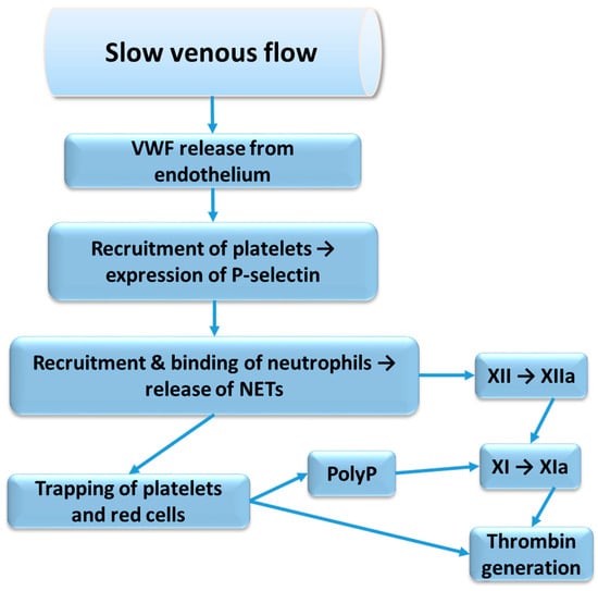 NETs can activate the intrinsic pathway directly via the activation of factor XII or via the release of polyP from trapped and thereby activated platelets. A possible sequence of events, starting from impaired venous flow and involving NET formation, is shown in Figure 2. Furthermore, leukocyte elastase, released from activated neutrophils, is known to cleave tissue factor pathway inhibitor (TFPI) by proteolysis of the polypeptide linking Kunitz-1 with Kunitz-2 domain, and thereby promote the extrinsic pathway of coagulation [39]. Activated platelets and endothelial cells release protein disulphide isomerase, which can alter the tissue factor conformation to allow for decryption and activation and further enhance the extrinsic pathway of coagulation [40].