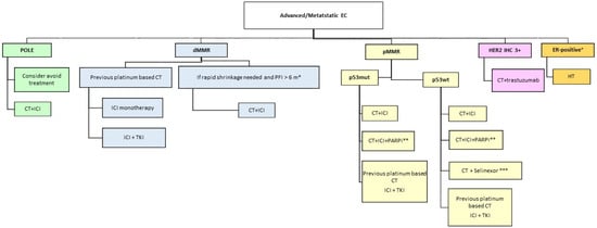 The possible actual therapeutic algorithm for EC is summarized in Figure 1. Although a direct comparison between different regimens is lacking, subgroup analyses according to molecular classification may provide some suggestions as to how to choose different regimens. For instance, PFS in the exploratory analyses of the RUBY trial showed a better PFS in the dostarlimab arm for the dMMR/MSI group and for p53abn [25]. However, the secondary analyses of MITO-END3 showed different results, with avelumab ineffective in patients carrying a mutation of TP53 [28]. So, more studies in this setting are needed. Patients with POLE-mut EC seem to have a very good prognosis regardless of the treatment received, also in advanced stages. Finally, the NSMP subgroup is a very heterogeneous group of patients that need to be studied in depth. In the exploratory analyses of the RUBY trial, this group seemed to not benefit from dostarlimab (HR, 0.77; 95% CI, 0.55–1.07) [25].