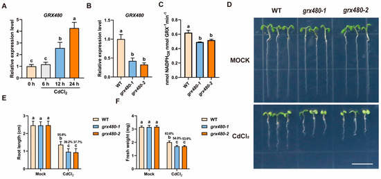 GRX480 mutants are hypersensitive to Cd stress. (A) The expression levels of GRX480 in 5-day-old wild-type seedlings subjected to 50 µM CdCl2 for 0, 6, 12 and 24 h and its control. Values are normalized to the 0 h control, with this baseline set at 1. Values represent the mean ± SEM of three independent experiments. (B) The expression levels of GRX480 in 5-day-old wild-type, grx480-1 and grx480-2 seedlings cultivated on 1/2 MS medium. Values are normalized to the untreated WT, with this baseline set at 1. Data are means ± SEM of three independent experiments. (C) The HED assay of 5-day-old wild-type, grx480-1 and grx480-2 seedlings grown on 1/2 MS medium. Different letters represent significant differences as determined using ANOVA followed by Tukey’s test (p < 0.05). (D) Representative images of 5-day-old wild-type, grx480-1 and grx480-2 seedlings grown on 1/2 MS medium with or without 50 µM CdCl2. Bar = 10 mm. (E,F) Root length (E) and fresh weight (F) of 5-day-old seedlings grown on 1/2 MS medium with or without 50 µM CdCl2. Values represent the mean ± SD of three independent experiments. Different letters represent significant differences as determined using ANOVA followed by Tukey’s test (p < 0.05, n > 60).