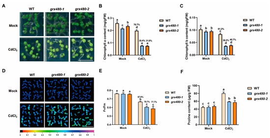 GRX480 mutants exhibit serious damage in photosynthesis under Cd stress. (A–C) Representative images (A) and chlorophyll a (B) and chlorophyll b (C) content of 5-day-old wild-type, grx480-1 and grx480-2 seedlings cultivated on 1/2 MS medium supplemented with or without 50 µM CdCl2. Bar = 10 mm. (D,E) Representative images (D) and intensity (E) of Fv/Fm of 5-old-day wild-type, grx480-1 and grx480-2 seedlings cultivated on 1/2 MS medium with or without 50 µM CdCl2. Bar = 10 mm. (F) The proline content of 5-day-old wild-type, grx480-1 and grx480-2 seedlings cultivated on 1/2 MS medium supplemented with or without 50 µM CdCl2. Values represent the mean ± SD of three independent experiments. Different letters represent significant differences as determined using ANOVA followed by Tukey’s test (p < 0.05).