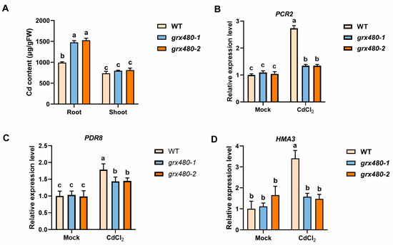 Metal ions are typically absorbed by active transport by plant root cells. Numerous studies have been conducted on the absorption, transport, and efflux of Cd ions [2,12,17,18,42]. In this study, we examined the expression of Cd efflux and transport-related genes in GRX480 mutants. Under Cd stress, the transcription of PCR2 and PDR8 was induced in WT and GRX480 mutants; however, the induction of these genes by Cd stress was alleviated in GRX480 mutants (Figure 3B,C). Notably, HMA3, which mediates vacuolar sequestration of Cd, exhibited similar expression levels in both WT and GRX480 mutants under control conditions; however, its induction by Cd stress was observed in WT, while this induction was abolished in GRX480 mutants (Figure 3D). These results suggest that the increased accumulation of Cd in mutants is derived from the alteration of Cd efflux and transport. These findings could potentially account for the observed difference in Cd content between the roots and shoots of the WT and GRX480 mutants.