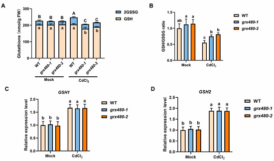 GRX480 mutants have less GSH compared with WT. (A) Glutathione (GSH plus 2GSSG) content of 5-day-old wild-type, grx480-1 and grx480-2 seedlings cultivated on 1/2 MS medium supplemented with or without 50 µM CdCl2. Values represent the mean ± SD of three independent experiments. Different letters represent significant differences as determined using ANOVA followed by Tukey’s test (p < 0.05), and capital letters represent total glutathione statistical analysis, while lowercase letters represent GSH difference analysis. (B) The relative ratio of GSH/GSSG of 5-day-old wild-type, grx480-1 and grx480-2 seedlings cultivated on 1/2 MS medium supplemented with or without 50 µM CdCl2. The data of untreated WT were set to 1. Values represent the mean ± SD of three independent experiments. Different letters represent significant differences as determined using ANOVA followed by Tukey’s test (p < 0.05). (C,D) The expression levels of GSH1 (C) and GSH2 (D) of 5-day-old wild-type, grx480-1 and grx480-2 seedlings cultivated on 1/2 MS medium supplemented with or without 50 µM CdCl2. The expression of these genes was quantified by RT-qPCR and the values are normalized to the untreated WT, with this baseline set at 1. Values represent mean ± SEM of three independent experiments. Different letters represent significant differences as calculated utilizing ANOVA followed by Tukey’s test (p < 0.05).