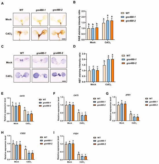 Under Cd stress, both WT and GRX480 mutants exhibited an increase in the precipitation of colored substances formed by DAB and NBT staining, with the grx480-1 and grx480-2 showing a more pronounced enhancement (Figure 5A,B). We quantified the staining intensity of DAB and NBT, although there was no statistically significant difference in the DAB staining intensity between WT and GRX480 mutants (Figure 5C,D).