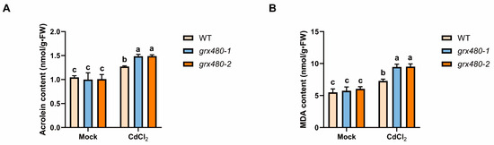 More RCS has accumulated in grx480 mutants. (A,B) The content of acrolein (A) and MDA (B) in 5-day-old wild-type, grx480-1 and grx480-2 seedlings cultivated on 1/2 MS medium supplemented with or without 50 µM CdCl2. Values represent the mean ± SD of three independent experiments. Different letters represent significant differences as determined utilizing ANOVA followed by Tukey’s test (p < 0.05).