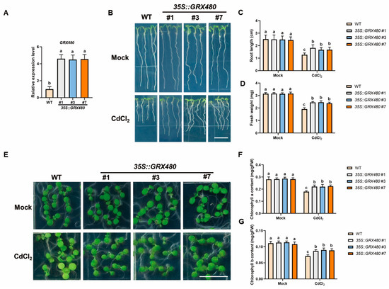 Overexpression of GRX480 enhances Cd stress tolerance. (A) The expression levels of GRX480 in 5-day-old wild-type, 35S::GRX480 #1, #3 and #7 seedlings cultivated on 1/2 MS medium. Values are normalized to the WT, with this baseline set at 1. Values represent the mean ± SEM of three independent experiments. Different letters represent significant differences as determined using ANOVA followed by Tukey’s test (p < 0.05). (B) Representative images of 5-day-old wild-type, 35S::GRX480 #1, #3 and #7 seedlings cultivated on 1/2 MS medium with or without 50 µM CdCl2. Bar = 10 mm. (C,D) Root length (C) and fresh weight (D) of 5-day-old seedlings grown on 1/2 MS medium with or without 50 µM CdCl2. Values represent the mean ± SD of three independent experiments. Different letters represent significant differences as determined using ANOVA followed by Tukey’s test (p < 0.05, n > 60). (E–G) Representative images (E) and chlorophyll a (F) and chlorophyll b (G) content of 5-day-old wild-type, 35S::GRX480 #1, #3 and #7 seedlings cultivated on 1/2 MS medium supplemented with or without 50 µM CdCl2. Bar = 10 mm. Values represent the mean ± SD of three independent experiments. Different letters represent significant differences as determined using ANOVA followed by Tukey’s test (p < 0.05).