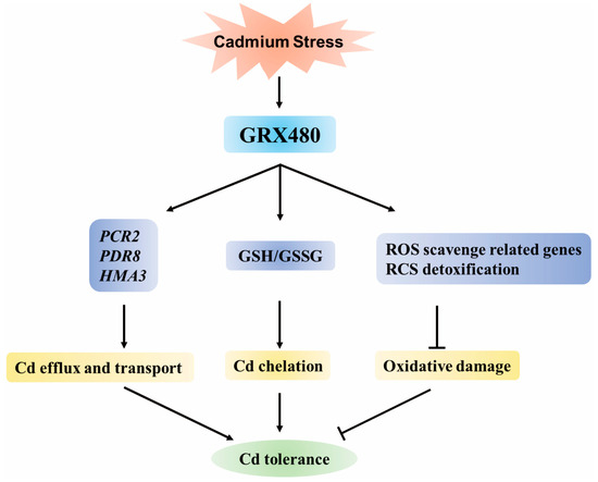 In conclusion, our research revealed the pivotal role of GRX480 in modulating plant responses to Cd stress, highlighting its multifaceted regulatory capabilities in enhancing plant Cd tolerance. The Cd-induced GRX480 enhances plants’ Cd tolerance by regulating the expression of Cd efflux and transport gene transcription to reduce Cd enrichment, as well as the expression of ROS scavenge enzyme encoding genes to reduce oxidative damage. Moreover, as a member of glutaredoxins, GRX480 is involved in influencing the balance between GSH and GSSG, thereby conferring tolerance to Cd in plants.