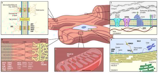 Visual illustration of the breadth of gene ontologies in dilated cardiomyopathy. Summarized are genes involved in (A) cell junctions, (B) the sarcomere, (C) mitochondria, (D) nuclear architecture and protein trafficking, and (E) cytoskeletal architecture (bold font—definitively pathogenic genes; standard font—putatively pathogenic genes).