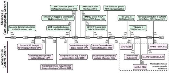 Finally, we can anticipate the next era, which we hope will be dominated by therapeutic advances in DCM treatment guided by or generated as a result of genetic and molecular genetic discovery. Gene-specific medications are starting to become available [281], though none has yet proven effective. Gene editing therapies are also being investigated. For example, CRISPR-Cas9 technologies have been used to modify genetic DCM causing variants in mice and human stem cells with promising results [282,283]. In-human studies are far rarer—the first such clinical trial (NCT05836259) for genetic cardiomyopathy is currently ongoing that targets the MYBPC3 gene implicated in HCM, but is still in the 1b phase [284]. Additional research is developing new viral vectors, also referred to as myotropic adeno-associated viral vectors (MyoAAVs), that are more specific to and effective at delivering therapeutic genes to cardiomyocytes [285].