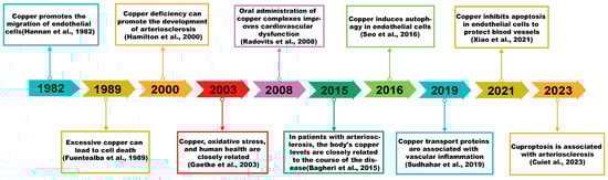 Copper and cardiovascular health. The timeline outlines significant historical milestones in the research advancements regarding copper’s association with AS [12,14,15,16,17,18,19,20,21,22].