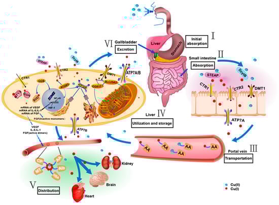 Copper absorption starts when divalent ions Cu(II) are ingested through the food chain into the human body [23]. Subsequently, these ions are efficiently absorbed in the stomach, duodenum, and epithelial cells of the small intestine. During this process, Cu(II) encounters metal reductases from the STEAP family and duodenal cytochrome b (Dcytb), which reduce it to monovalent ions Cu(I). Subsequently, Cu(I) enters the cell through the actions of copper transporter 1 (CTR1, also known as SLC31A1), copper transporter 2 (CTR2, also known as SLC31A2), and divalent metal transporter 1 (DMT1) [24].