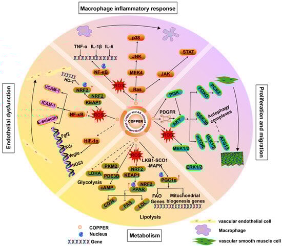 When present in excess, copper ions act as a catalyst for triggering inflammatory responses, thereby exacerbating the inflammation of blood vessel walls and accelerating the progression of CVD [55]. Specifically, copper can stimulate the release of chemotactic factors, which serve as guiding signals, leading monocytes to transform into macrophages and prompting them to engulf LDL. Subsequently, these macrophages further transform into foam cells, a process that is a significant hallmark of early atherosclerotic lesions. Additionally, the activation of the mitogen-activated protein kinase (MAPK) signaling pathway requires the participation of copper ions. Catalyzed by copper, it can bind to mitogen-activated protein kinase kinase 4 (MEK4), thereby promoting the activation of downstream c-Jun N-terminal kinase (JNK) and P38 [56]. These molecules are key factors in regulating inflammatory responses, and under the induction of copper, they further intensify the inflammatory reaction. Meanwhile, copper-induced oxidized low-density lipoproteins can also induce oxidative stress within cells, and in this process, activate Janus Kinase 2 (JAK2), which further activates signal transducer and activator of transcription (STAT) to regulate cellular inflammation [57,58,59].