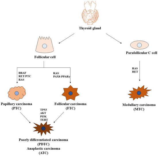 It is now accepted that DTCs may arise from preexisting benign tumors of follicular cells showing specific morphological features and genetic alterations, but they can also arise de novo. Undifferentiated malignancies usually originate from preexisting DTCs, but they too may develop de novo [4,5,6]. Thyroid carcinogenesis is driven by mutations or rearrangements of specific genes responsible for thyroid cancer cell proliferation and survival, as well as thyroid cancer progression via different signaling pathways involving the activation of MAPK/PI3K/AKT cascades. The majority of these alterations are mutually exclusive activating mutations in BRAF or RAS oncogenes and rearrangements of RET, ALK, and NTRK genes. A small fraction is represented by loss-of-function mutations of tumor suppressor genes, such as PTEN, PPARγ, and TP53 [7].