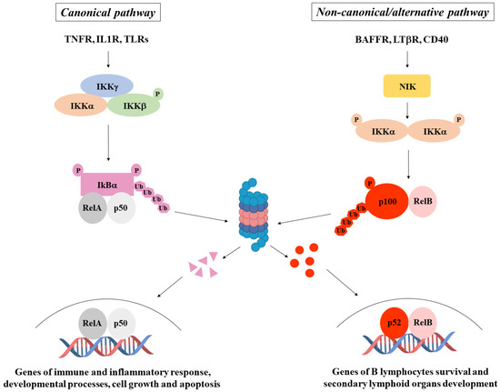 NF-κB pathways. NF-κB activation occurs through a canonical pathway (on the left), generally triggered by immune and inflammatory stimuli, and a non-canonical/alternative pathway (on the right), mainly induced by genes regulating B lymphocyte survival and secondary lymphoid organ development.