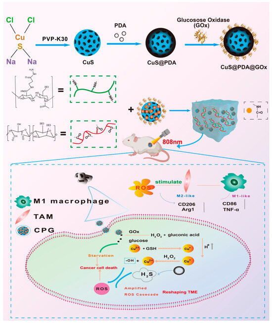 With advancements in multifunctional nano biomaterials, nanotechnology is becoming a focal point in cancer therapy. Studies have shown that nanomedicines containing copper sulfide (CuS) can be effective for melanoma treatment [6,7]. However, the limitations and potential drug resistance associated with nanomedicines necessitate combining nanotechnology with other therapies. Photothermal therapy (PTT) using a near-infrared laser (NIR) is emerging as a novel treatment option [8,9]. PTT employs a near-infrared (NIR) laser and photo-absorbing agents to generate heat from light energy to “burn” cancer cells [10]. Polydopamine (PDA), known for its biocompatibility and strong photothermal conversion ability [11,12,13], is ideal for PTT materials [14]. Nonetheless, the inflammatory environment induced by PTT can favor melanoma recurrence, and the anti-tumor immune response remains insufficient to prevent recurrence [15,16,17].