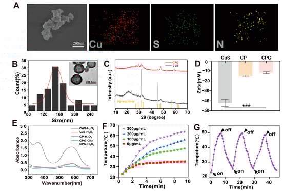 Preparation and characterization of CPG: (A) EDS image of CPG. (B) Size distribution and TEM image of CPG. (C) XRD image of CPG. (D) zeta potential maps of CuS, CP, CPG. (E) CAS-H2O2, CuS-H2O2, CP-H2O2, CPG-H2O2, CPG-Glucose (Glu) for the determination of -OH generation. (F) Photothermal heating curves for 10 min at different concentrations of CPG. (G) Photothermal stability of CPG with 3 on/off cycles. (Mean ± SD (n = 3)). *** p < 0.001.