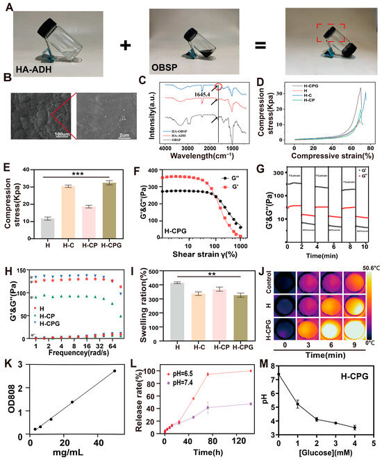 Morphology, degradation properties, mechanical properties, and photothermal properties of H-CPG hydrogels: (A) Optical images of hydrogels. The two solutions of HA-ADH and OBSP were mixed in the same volume. (B) SEM plots of the hydrogels of H-CPG. (C) FTIR plots of H-CPG, HA-ADH, OBSP. (D) Tensile stress–strain curves of the hydrogels of H, H-C, H-CP, H-CPG. (E) H, H-C, H-CP, H-CPG hydrogels of maximum withstand pressure plots. (F) H-CPG strain scans showing gel–sol transition points. (G) G′ and G″ change curves of H-CPG hydrogel at alternating high strain (400%) and low strain (1%). (H) Oscillation frequencies (1–100 rad/s) of scanned H-CPG hydrogels at 37 °C and 1 Hz. (I) H, H-C, H-CP, H-CPG hydrogels swelling properties in PBS at 37 °C. (J) Photothermal images of PBS, H, and H-CPG at 10 min. (K) Standard curve of CuS@PDA@GOx. (L) CPG release profiles of H-CPG at (pH = 7.4) and (pH = 6.5). (M) Degradation of glucose by H-CPG hydrogels. (Mean ± SD (n = 3) ). ** p < 0.01, and *** p < 0.001.