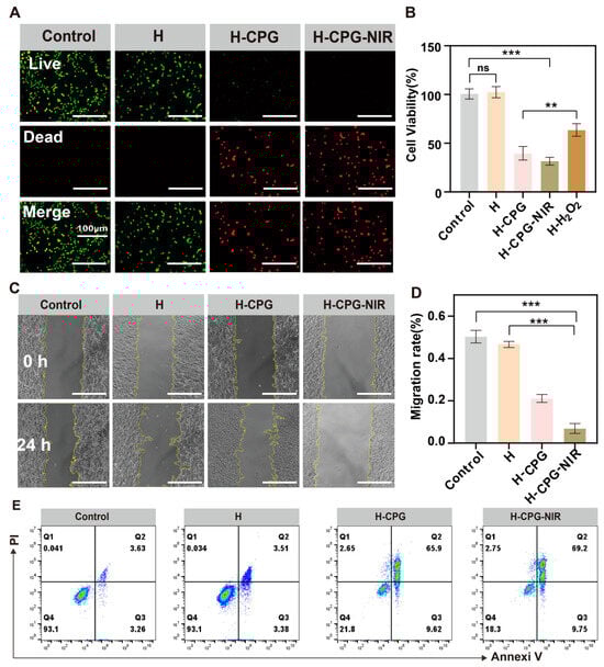 In vitro antitumor activity of hydrogels: (A) Live/dead staining images of B16F10 cells after various treatments. Scale bar: 100 µm. (B) Cell viability of B16F10 cells after different materials treatments. (C) Migration images of B16F10 cells after different materials treatments. Scale bar: 100 µm. (D) Visualized mobility of B16F10 cells after different materials treatments. (E) Flow-through apoptosis images of B16F10 cells after different materials treatments. (Mean ± SD (n = 3)). ns indicates no significant difference. ** p < 0.01, and *** p < 0.001.
