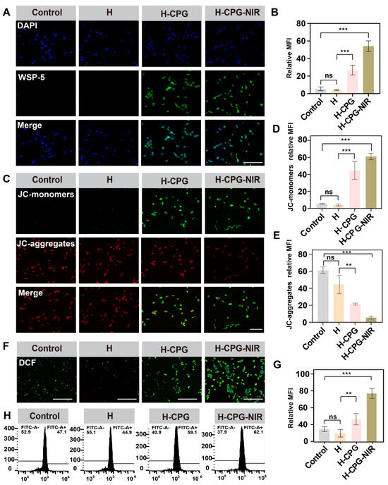 To understand the mechanisms of cancer cell death, we investigated the indicators related to CDT. In this study, CPG can react with intracellular glucose and O2 to generate H2O2 and gluconic acid, and the concentration of H2O2 is significantly increased with the increase in CPG concentration (Figure S6). The H2S-specific fluorescent probe wsp-5 was utilized to detect the release of H2S from the cells. No significant fluorescence was observed in both the Control and H groups, suggesting the non-detection of H2S (Figure 5A). In the H-CPG and H-CPG-NIR groups, the cells presented high levels of H2S, and the fluorescence was stronger in the 808 nm NIR group, which was attributed to the fact that light accelerates the release of H2S. Mitochondria play a crucial role in tumorigenesis. The mitochondrial membrane potential (MMP) JC-1 probe is a commonly used indicator. JC-1 aggregates fluorescent red in healthy mitochondria, while JC-1 monomers emit fluorescent green in abnormal mitochondria depolarized by MMP. The strongest green fluorescence was observed in the H-CPG-NIR group, suggesting that CPG causes the most significant mitochondrial dysfunction by releasing H2S (Figure 5C).