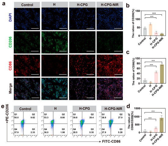 H-CPG-induced immunotherapy: (a) Immunofluorescence of TAM cells after different materials treatments. Scale bar: 100 µm. (b) Percentage of CD206 positive cells corresponding to Figure A. (c) Percentage of CD86 positive cells corresponding to Figure A. (d) Percentage of CD86/CD206 cells corresponding to Figure A. (e) Flow chart of TAMs cells after different materials treatments. (Mean ± SD (n = 3)). *** p < 0.001).
