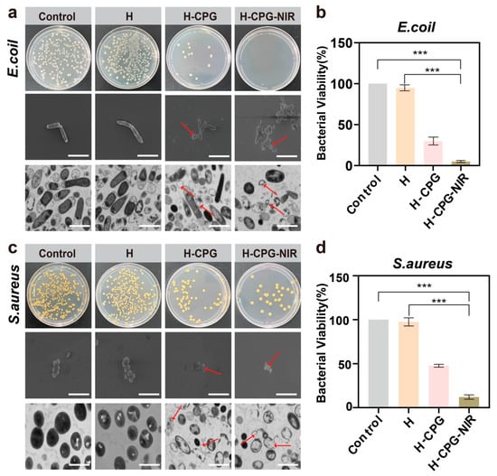 Evaluation of the antimicrobial effect: (a) Antimicrobial effect of different materials against E. Coil. The arrow points to the damaged bacterial structure. Scale bar: 2 µm. (b) Relative survival of E. coli corresponding to Figure a. (c) Antimicrobial effect of different materials against S. aureus. Scale bar: 2 µm. (d) Relative survival of S. aureus corresponding to Figure d. (Mean ± SD (n = 3). *** p < 0.001).