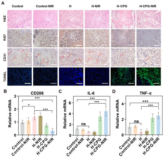 (A) Photographs associated with histological analysis of tumor cells after 18 days of treatment. The red arrow represents the tumor vascular marker. Scale bar: 200 µm. (B) Percentage of CD206 immune cells after treatment with different drugs.(C) Percentage of IL-6 immune cells after treatment with different drugs. (D) Percentage of TNF-α immune cells after treatment with different drugs. (Mean ± SD (n = 5)), ns indicates no significant difference. * p < 0.05, and *** p < 0.001.