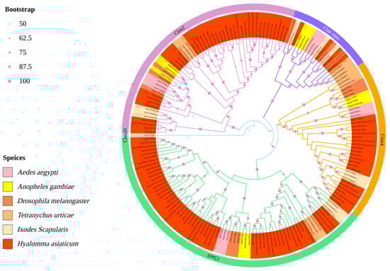 The prolonged application of chemical acaricides has resulted in the issue of tick resistance [4]. One form of this resistance stems from metabolic adjustments facilitated by detoxification enzymes [5]. CYP450 is distributed in all organisms, including animals, plants, and fungi, and has a remarkable catalytic ability to promote more than 20 types of oxido-reactions, including oxidation and epoxidation [6,7]. Cytochrome p 450 (CYP 450) is the phase Ⅰ detoxification enzyme of the insect detoxification system [8]. In traditional classification, insect CYP450s have five conserved motifs (Helix–C, Helix–I, Helix–K, PERF, and heme-binding), which have been classified as mitochondrial CYP clan, CYP2 clan, CYP3 clan, and CYP4 clan [9]. Nevertheless, recent reclassifications have introduced two additional categories, the CYP20 and CYP16 clans [10]. CYP450s are integral to numerous insect life processes. More specifically, CYP2 is involved in ecdysteroid and juvenile hormone biosynthesis [10,11], while mitochondrial CYPs participate in the metabolism of fatty acids, sterols, and hormones. The CYP3 gene plays a role in the synthesis of insecticides (CYP6 and CYP9 families in the CYP3 clan [12]) and the metabolism of plant secondary metabolites. CYP4 is linked to pheromone metabolism [12,13]; however, the functions of CYP20 and CYP16 remain uncertain.