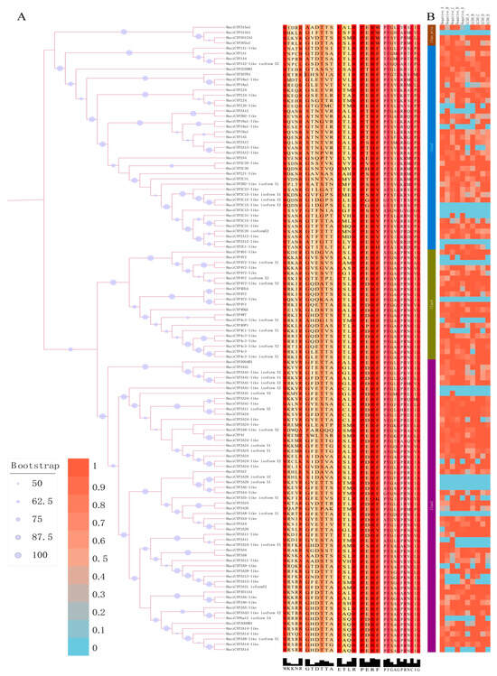 The distribution and expression patterns of conserved motifs within the CYP450 family of H. asiaticum. (A) Analysis of conserved motifs of CYP450 family members in H. asiaticum. (B) Expression profiles of CYP450 family members in H. asiaticum under terpinolene stress.