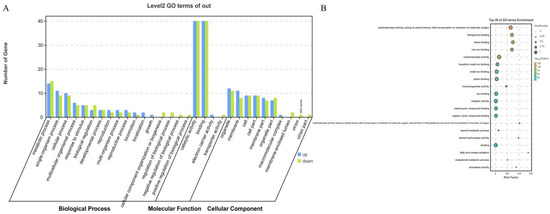 Functional annotation of the CYP450 gene family within the GO in H. asiaticum under terpinolene stress. (A) Functional analysis of CYP450 family GO terms in H. asiaticum. (B) Enrichment analysis of CYP450 family GO terms in H. asiaticum.