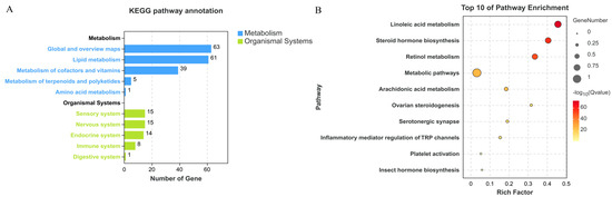 KEGG pathway annotation annotates the CYP450 gene of H. asiaticum according to metabolic and organismal systems. The metabolism category includes global and overview maps, lipid metabolism, metabolism of cofactors and vitamins, and metabolism of terpenoids and polyketides. Lipid metabolism and global and overview maps were the metabolic classes containing the most genes, with values of 61 and 63, respectively (Figure 4A). Pathway enrichment results showed that the top 10 pathways involved in CYP450 were, in order, linoleic acid metabolism (ko00591), steroid hormone biosynthesis (ko00140), retinol metabolism (ko00830), metabolic pathways (ko01100), arachidonic acid metabolism (ko00590), ovarian steroidogenesis (ko04913), serotonergic synapses (ko04726), inflammatory mediator regulation of TRP channels (ko04750), platelet activation (ko04611), and insect hormone biosynthesis (ko00981) (Figure 4B).