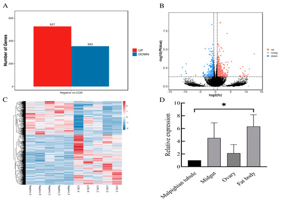 Genes differentially expressed under terpinolene stress: (A) statistics pertaining to the count of differentially expressed genes; (B) the volcano plot representation of differentially expressed genes; (C) a heatmap illustrating hierarchical clustering of differentially expressed genes; (D) results showing the relative expression of significantly up-regulated H. asiaticum CYP3A8 genes within varying tissues. Note: * indicates significant differences (p < 0.05) in CYP3A8 gene between malpighian tubule and fat body.