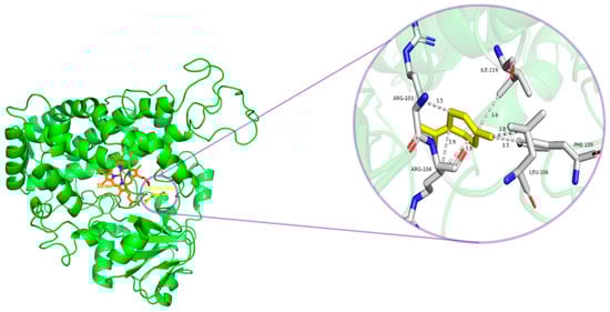 Molecular docking serves as a computer-aided drug design method and is noted to facilitate the production of acaricides that exhibit superior resistance effects [4]. It also plays a pivotal role in understanding molecular interactions in various biological processes, including signal transduction, enzyme catalysis, and drug action [60]. Currently, molecular docking is leveraged to assess the binding capacity and mechanism of natural products to tick receptor targets or detoxification enzymes [61,62,63]. In this study, we evaluated the binding mechanism of H. asiaticum CYP3A8 protein to terpinolene by using molecular docking. Results indicated that the CYP3A8 protein from H. asiaticum hydrophobically interacted with terpinolene via the amino acid residues ARG-103, ARG-104, LEU-106, PHE-109, and ILE-119, exhibiting strong binding capacity (affinity = −5.6 kcal/mol). Molecular docking facilitates the exploration of receptor binding sites and explains the varying potencies of compounds [64]. Analysis of the conservation of the five amino acid residues from H. asiaticum, which bind to terpinolene, in the homologous sequences of the 12 species suggested that four are non-conserved sites, with the exception of ARG-103. Thus, different tick species and CYP450 genes in H. asiaticum may have varying metabolism potencies for terpinolene. These findings provide novel insights for further investigation into the mechanism of terpene metabolism in ticks.
