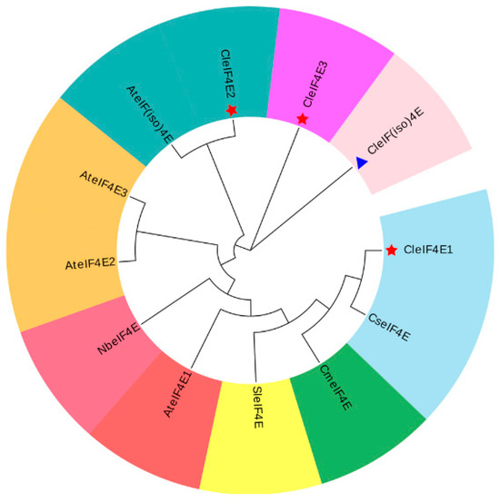 Phylogenetic relationships among CleIF4E proteins and other eIF4E proteins from various plants in the NCBI database. The red pentagram symbol represents the three identified CleIF4E proteins, while the blue triangle symbol represents one identified CleIF(iso)4E protein.