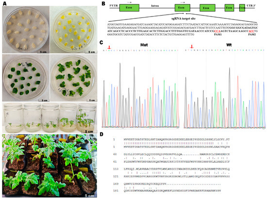 Editing of CleIF4E1 in watermelon using CRISPR/Cas9 technology. (A) Process for selecting edited lines from the cotyledon to adult plants. (B) Genomic map and CleIF4E1 target sites. The protospacer adjacent motif (PAM) is indicated with underlined red letters. (C,D) Comparison of the eIF4E nucleotide sequence and amino acid sequence between wild-type (wt) and mutant lines. Red arrows indicate the Cas9 cleavage sites.