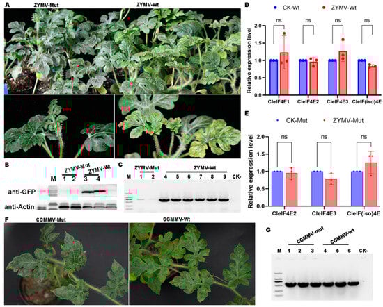 Disease symptoms on CleIF4E1 knockout mutant and wild-type (Wt) plants infected with ZYMV and CGMMV. (A) Symptoms on ZYMV-GFP-infected mutant and Wt plants at 21 days post-inoculation (dpi). (B) Accumulation of ZYMV-GFP in mutant and Wt plants determined using an anti-GFP antibody. (C) RT-PCR results for the viral accumulation in mutant and Wt plants inoculated with ZYMV-GFP. (D,E) Relative CleIF4E expression levels in mutant and Wt plants during an infection by ZYMV-GFP. The results were shown as means ± standard deviations of three independent experiments. The ns means no significant differences. (F) Symptoms on mutant and Wt plants infected with CGMMV at 21 dpi. (G) RT-PCR results for the viral accumulation in mutant and Wt plants inoculated with CGMMV.