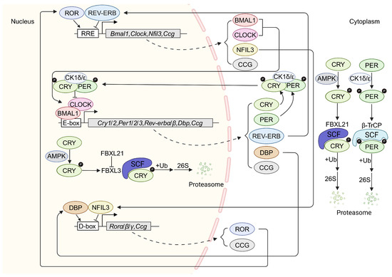 The molecular architectures of the core circadian clock and peripheral tissue circadian clock are essentially the same. Both rely on interlocking transcription‒translation feedback loops (TTFLs) (Figure 1) [2,37,38]. In the core of these loops, the basic helix–loop–helix (bHLH)-Per-Arnt-Sim (PAS) transcription factors BMAL1 and CLOCK form heterodimers to promote the transcription of genes with an E-box (CACGTG) in their promoter and/or enhancer regions, including clock genes Period (Per1, Per2, Per3), Cryptochrome (Cry1, Cry2), Rev-erbα/β, Rorα/β/γ, and D-box binding protein gene (Dbp), thereby increasing the translation and accumulation of the corresponding proteins in the cytoplasm [39,40,41]. PER and CRY form a repressive complex with casein kinase 1δ/ε (CK1δ/ε), and the complex enters the nucleus and binds to CLOCK-BMAL1 heterodimers to form a tetra complex to inhibit the transcriptional activity of CLOCK-BMAL1, thereby repressing their own expression [42,43]. In the second interlocked loop, the REV-ERBα/β and RORα/β/γ proteins compete for binding to the REV-ERB/ROR-binding element (RRE) ([A/T]A[A/T]NT[A/G]GGTCA) in the promoter region, regulating the transcription of Clock, Bmal1, and Nfil3 [44]. In the last interlocked loop, DBP activates while NFIL3 inhibits the expression of Rorα/β/γ through the D-box (TTA[T/C]GTAA), increasing the complexity of the entire negative feedback transcriptional regulatory mechanism [44,45,46,47]. These loops also control the expression of clock-controlled genes (Ccgs), which mediate circadian output [9,48,49,50] The maintenance of circadian rhythms by the evolutionary conserved circadian clock depends on the rhythmic expression of Ccgs, which depends significantly on cell and tissue types, the physiological and pathological state, as well as the criteria used for detecting rhythmicity [32,33].