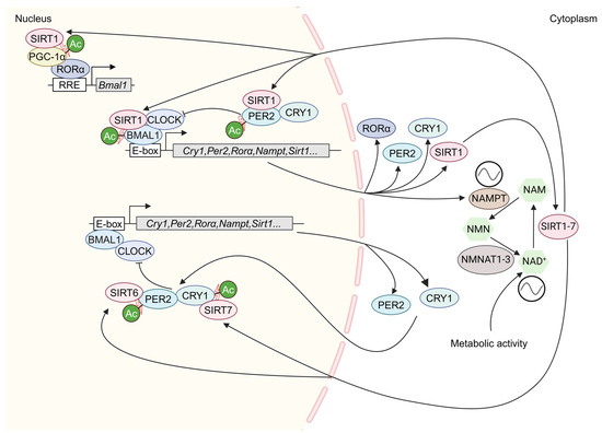 The circadian clock system, through the rhythmic expression of clock genes and clock-controlled genes, is widely involved in the regulation of various physiological processes, such as lipid metabolism, cholesterol synthesis, glucose metabolism and transport, and oxidative phosphorylation, and plays an important regulatory role in metabolism [125,126,127]. NAD+, a coenzyme of sirtuins, is a rhythmic metabolite regulated by the circadian clock that plays a crucial role in linking the circadian clock with sirtuins [128,129].