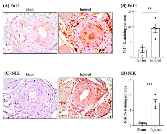 An increased immunostaining for the intracellular kinase NIK, an intracellular target of Fn14 that links Fn14 activation to activation of the proinflammatory NFκB transcription factor, was also observed (Figure 1C,D; sham 0.75 ± 0.20 and injured 7.49 ± 1.04% expression).