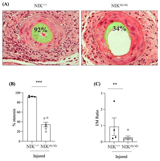 To characterize the role of NIK during endothelial injury, injured femoral arteries from wild-type mice were studied as a control group (NIK+/+) two weeks after guidewire-induce endothelial denudation and compared with injured femoral arteries from NIK-deficient homozygous mice (NIKaly/aly) analyzed at the same time point. In hematoxylin-eosin (HE)-stained sections, the sham-operated arteries had a normal appearance. Following the endothelial denudation, intimal hyperplasia developed in at least one sample of every arterial segment. The injury was milder in the arteries from the NIK-deficient homozygous mice (NIKaly/aly) than in the arteries from the wild-type (NIK+/+) mice, as assessed by the intimal hyperplasia resulting in an increased intima/media (I/M) ratio (NIK+/+ 0.93 ± 0.53 vs. NIKaly/aly 0.26 ± 0.02) and % stenosis (NIK+/+ 92.01 ± 0.74 vs. NIKaly/aly 34.32 ± 5.37) (Figure 2).