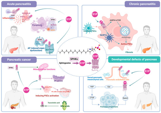 Pancreatitis is a prevalent exocrine inflammatory condition of the pancreas, which includes both acute pancreatitis (AP) and chronic pancreatitis (CP) [7]. AP is characterized by edema, acinar cell necrosis, hemorrhage, and severe inflammation of the pancreas, typically manifesting as sudden onset and severe abdominal pain [8,9]. Meanwhile, CP is a clinical condition that develops as a result of the ongoing inflammation and chronic fibrosis of the pancreatic acini, leading to irreversible structural damage [10]. PC, often referred to as the “King of Cancer”, is a highly lethal malignancy, resulting in a considerable economic burden on families and society [11]. Notably, recurrent AP can give rise to CP, which stands as a prominent etiological factor in the development of PC [12,13]. Furthermore, the developmental defects of pancreas (DDP) are closely related to these pancreatic disorders [14]. However, the understanding of the pathogenesis underlying these pancreatic diseases remains incomplete, and there is currently a lack of specific treatments available. Recently, increasing evidence has suggested that sphingosine-1-phosphate (S1P)-associated cellular and biological mechanisms participated in the onset and progression of these pancreatic diseases.
