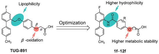 TUG-891 showed good activity and selectivity; however, no clinical assessments were performed, suggesting that it may have some deficiencies to meet the requirements of clinical trials, such as poor pharmacokinetic properties due to high lipophilicity and β-oxidation of carboxylic acid [43,44,45]. In this study, novel FFAR4 agonists were designed based on the structure of TUG-891 to improve hydrophilicity by replacing the linking oxymethylene with an amide group and to improve metabolic stability by replacing the β-carbon atom with an oxygen atom. To elucidate the structure–activity relationship of the agonists, a series of novel phenoxyalkanoic acid derivatives were designed by introducing electron-donating or withdrawing substituents on the phenyl ring proximal to the carboxyl group and varying the length of carbon chains between the phenyl ring and the carboxyl group (Figure 2). The FFAR4 agonist activity was assessed in vitro, while hypoglycemic effects and pharmacokinetic properties were evaluated in vivo to identify compounds exhibiting enhanced agonistic activity, metabolic stability, and hydrophilicity.