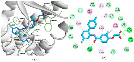 Compound 10f exhibited the best FFAR4 agonistic activity among the synthesized compounds. To investigate the mode of interaction of the synthesized compounds with FFAR4, molecular docking was performed using BIOVIA Discovery Studio software v21.1.0.20298 to explain the potential intermolecular interactions between compound 10f and FFAR4. Molecular docking results confirmed that compound 10f interacted well with FFAR4, and the combinatory effect was relatively steady. The carboxyl group of compound 10f formed hydrogen bonds with TRP198 and ASN291, which played a vital role in stabilizing its binding mode. In addition, the amide group of compound 10f was able to form a hydrogen bond with THR119, which is advantageous for stabilizing the structures of the complexes. In addition, the aromatic ring moieties of 10f exhibited several π-π and π–alkyl interactions with the pocket amino acids of FFAR4, including PHE115, PHE211, ILE280, and ILE284 (Figure 3a,b).